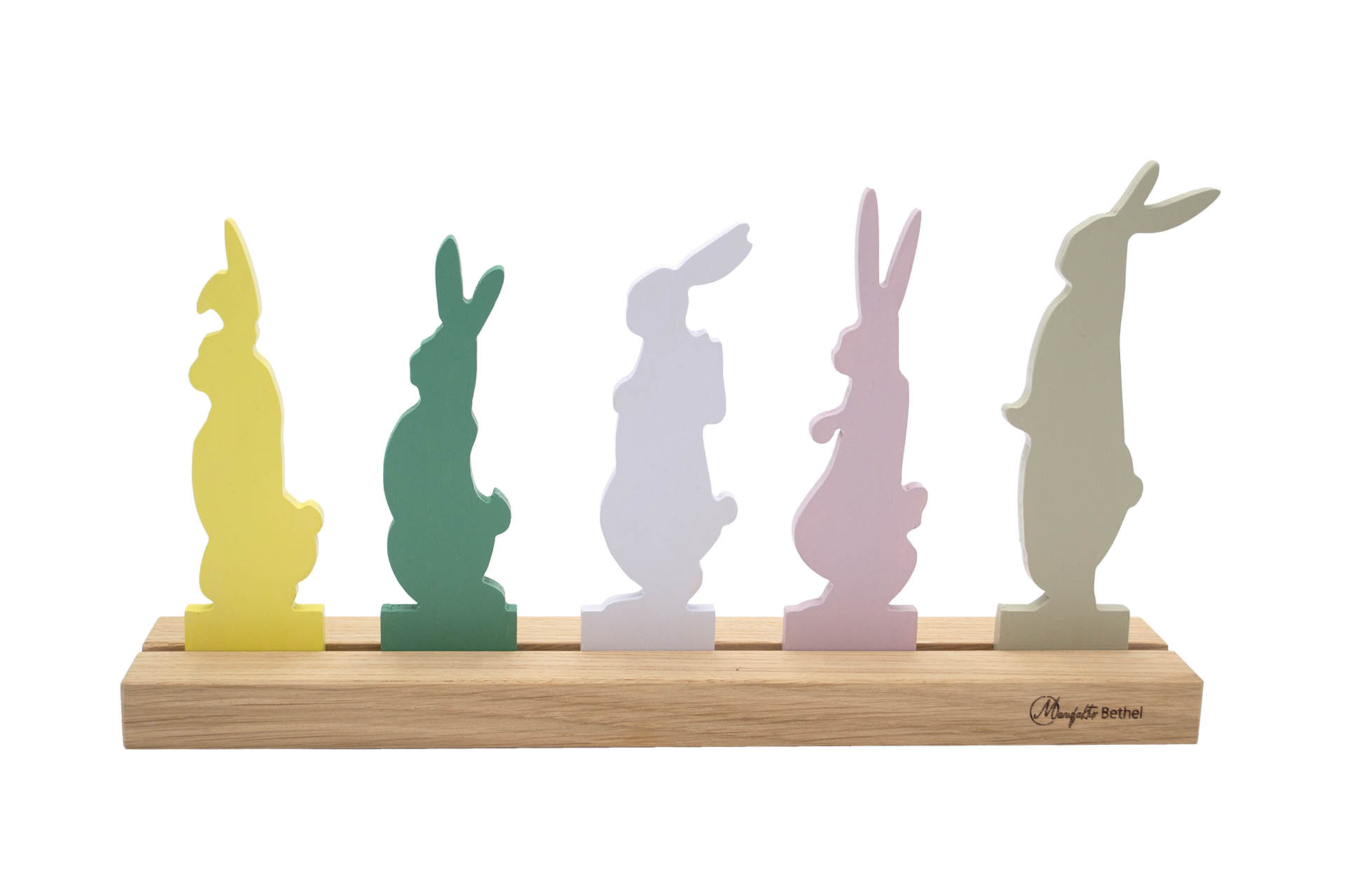 Die "Osterbande" entspringt der nostalgischen Bilderbuchgeschichte. Seit Generationen weckt sie Kindheitserinnerungen und stimmt auf die Osterzeit ein. Aufgemacht in tollen Farben, stehen handbemalte Osterhasen in Reihe auf einer Schiene aus hochwertigem Eichenholz. Die Figuren lassen sich unterschiedlich anordnen. Die Schiene verfügt über eine Nut von 7 mm und kann somit auch für andere Objekte in dieser Stärke genutzt werden.