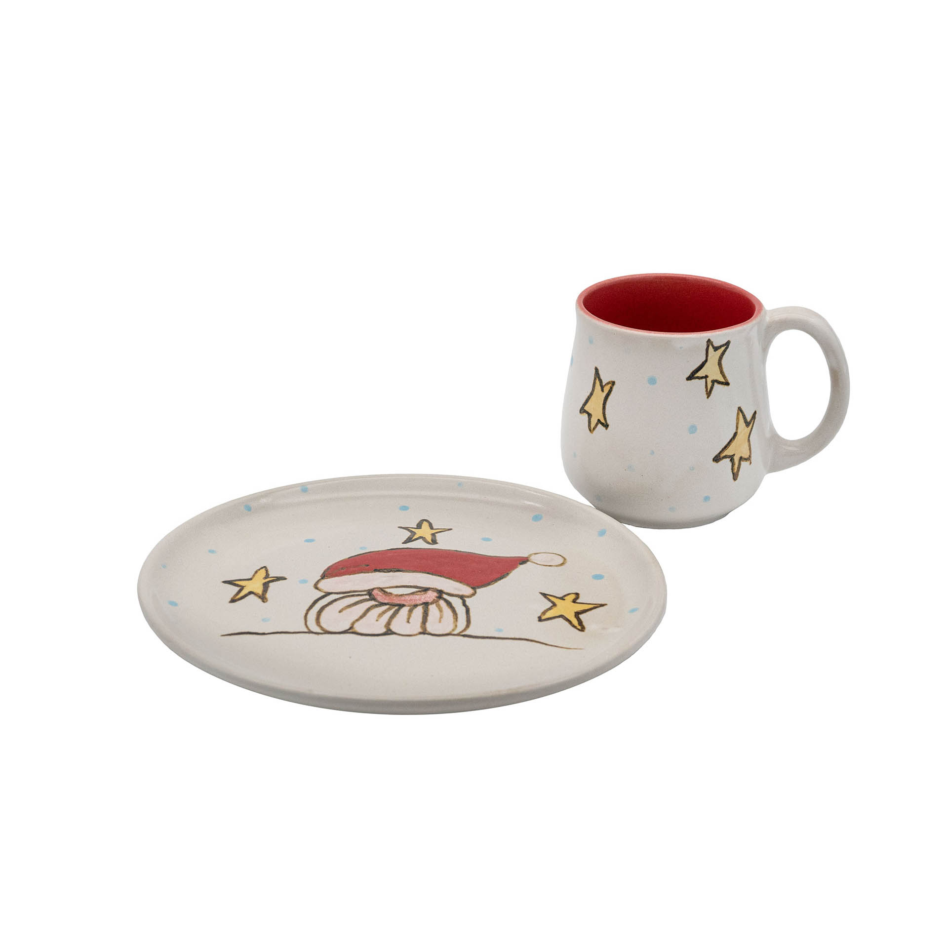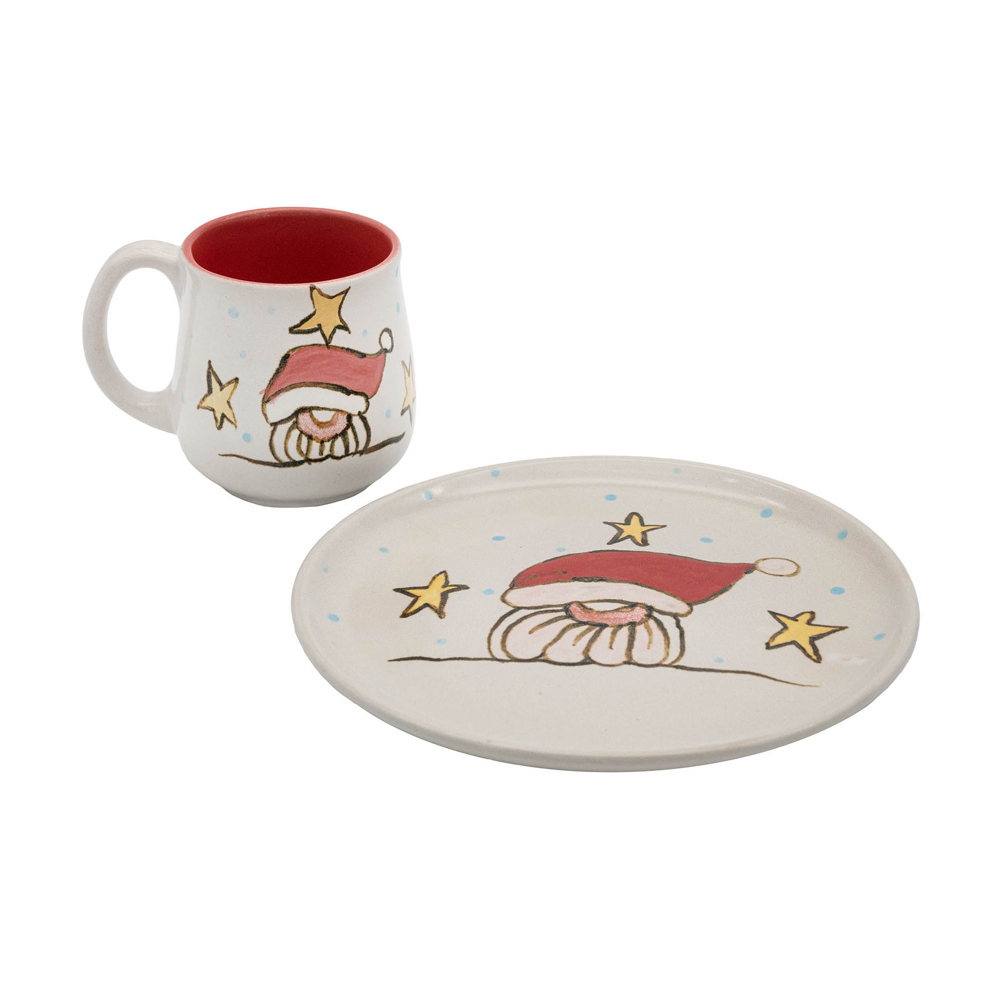 2- teiliges Geschirrset bestehend aus Teller und Tasse aus Steinzeug. Da wir das Wichtelmotiv in liebevoller Handarbeit malen, ist jedes Stück ein klein wenig anders und individuell.