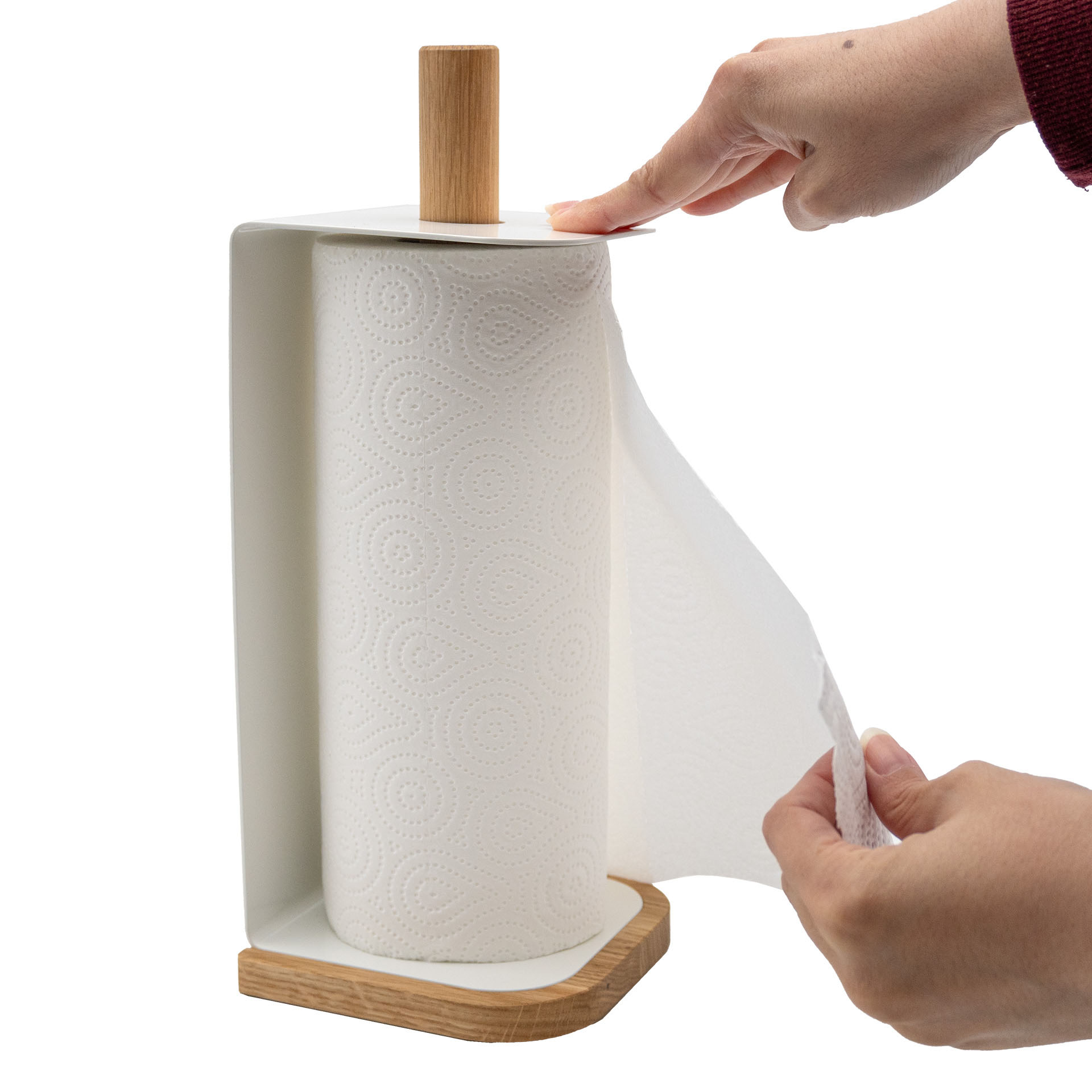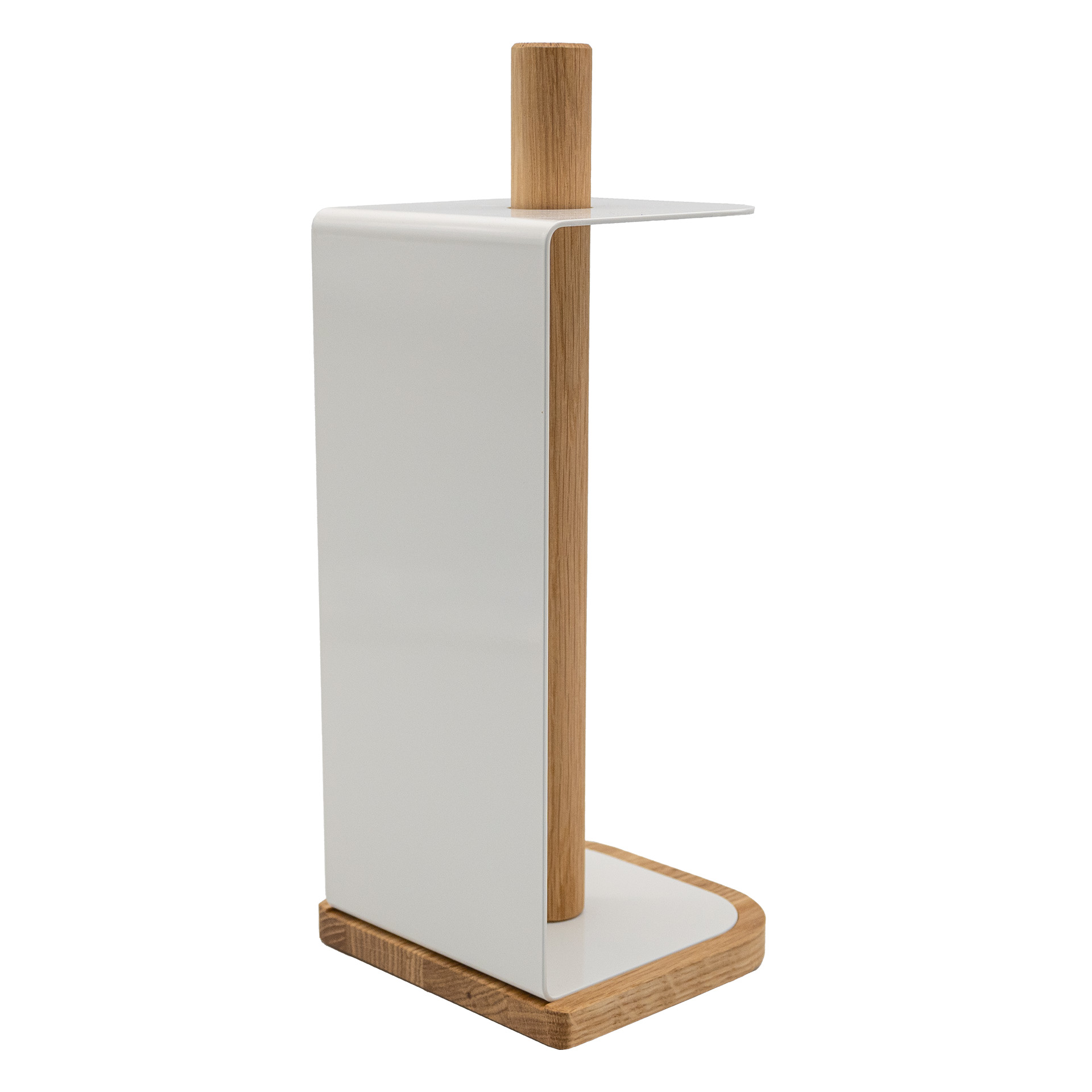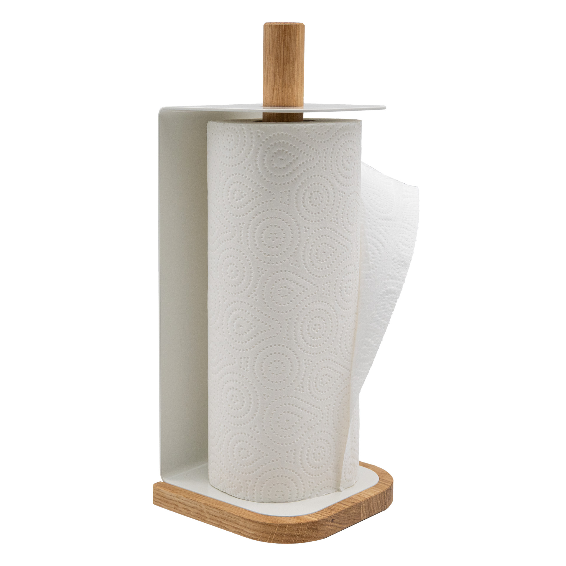 Stylische Küchenhilfe mit Funktionalität. Hergestellt aus Eichenholz und weiß pulverbeschichtetem Metall in schlichter nordischer Formensprache, mit Platz für Standard Küchenrollen. Einfach den Mittelstab herausdrehen und die Küchenrolle einlegen. Der Clou: Mit leichtem Druck auf den oberen Bügel können Blätter problemlos abgerissen werden.