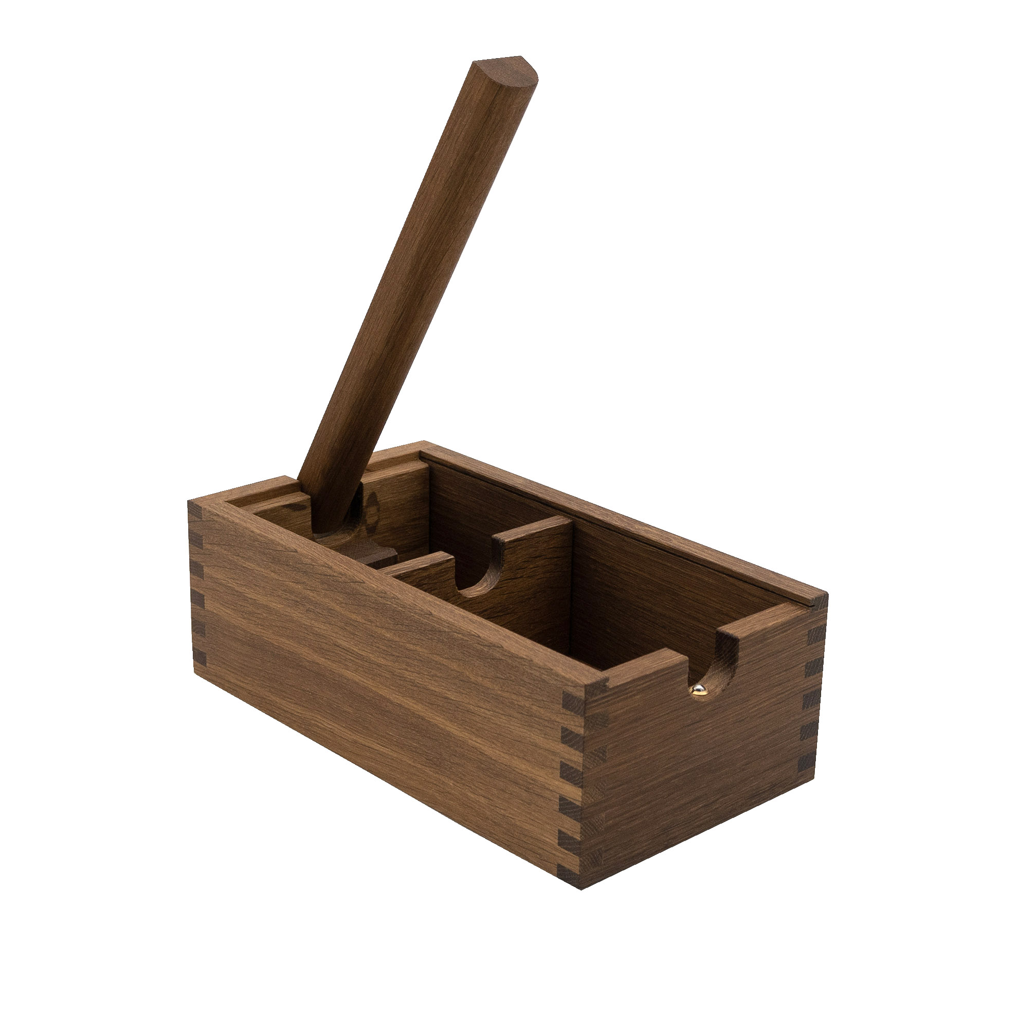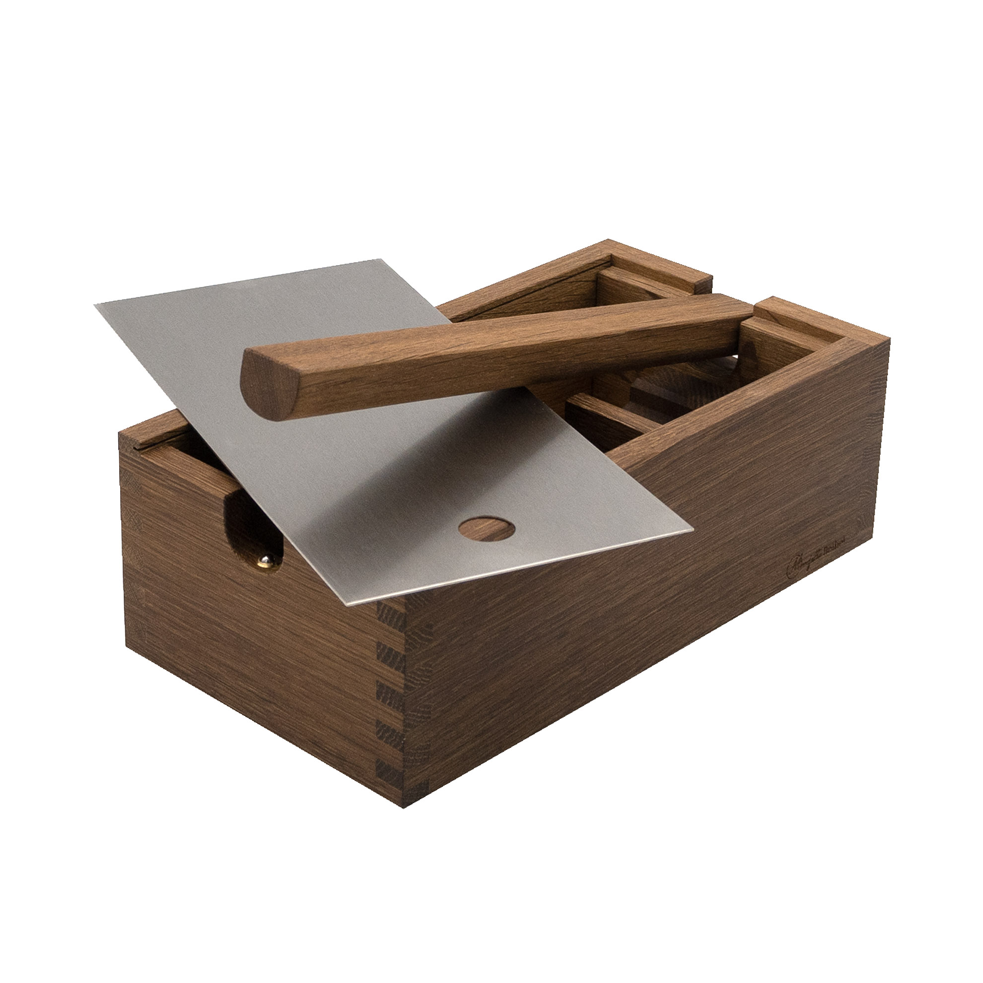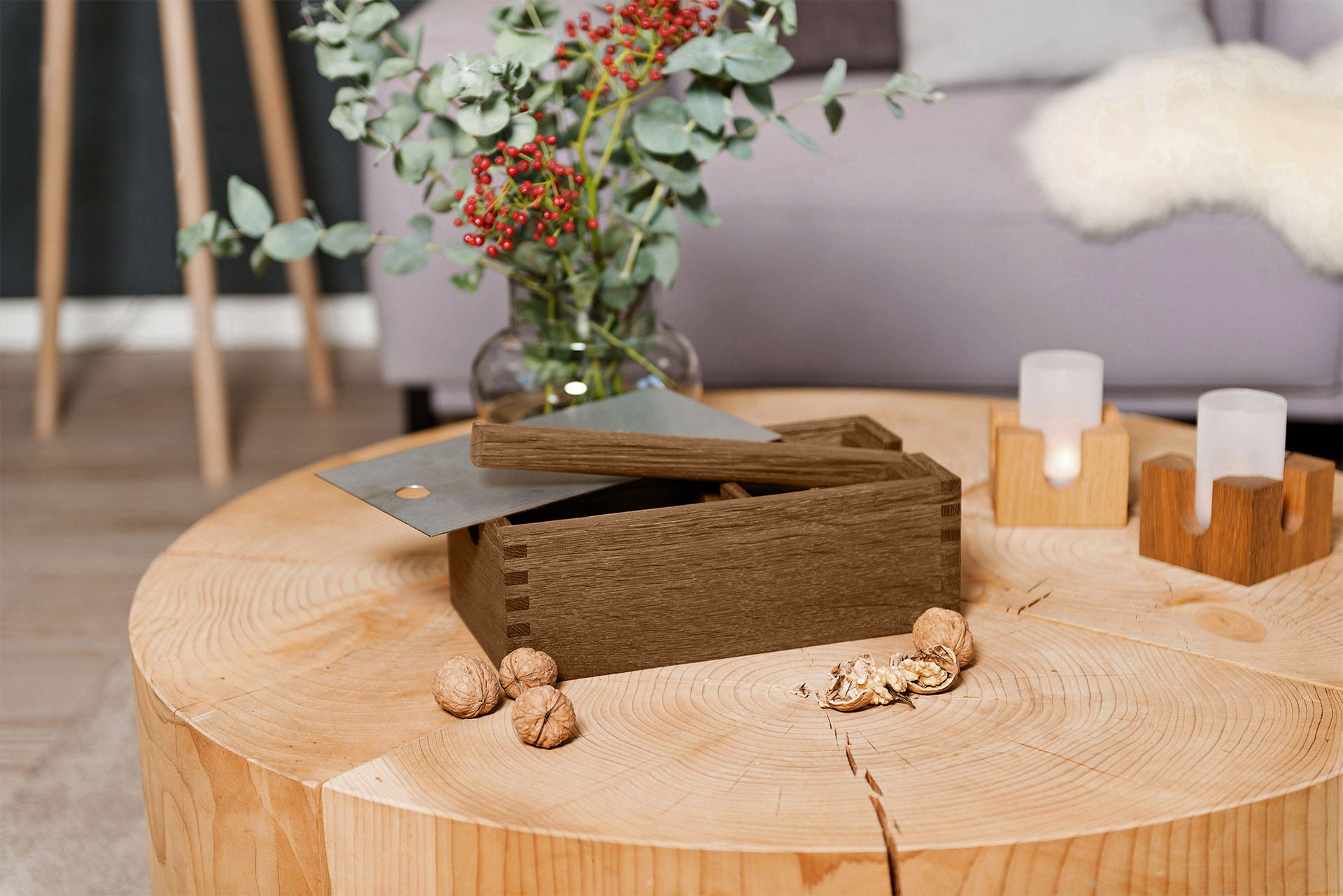 Unser Premiumnussknacker aus massiver, geräucherter Eiche. Mit elegantem Deckel aus hochwertigem gebürstetem Edelstahl,  können Nüsse und Schalen krümelfrei verstaut werden.