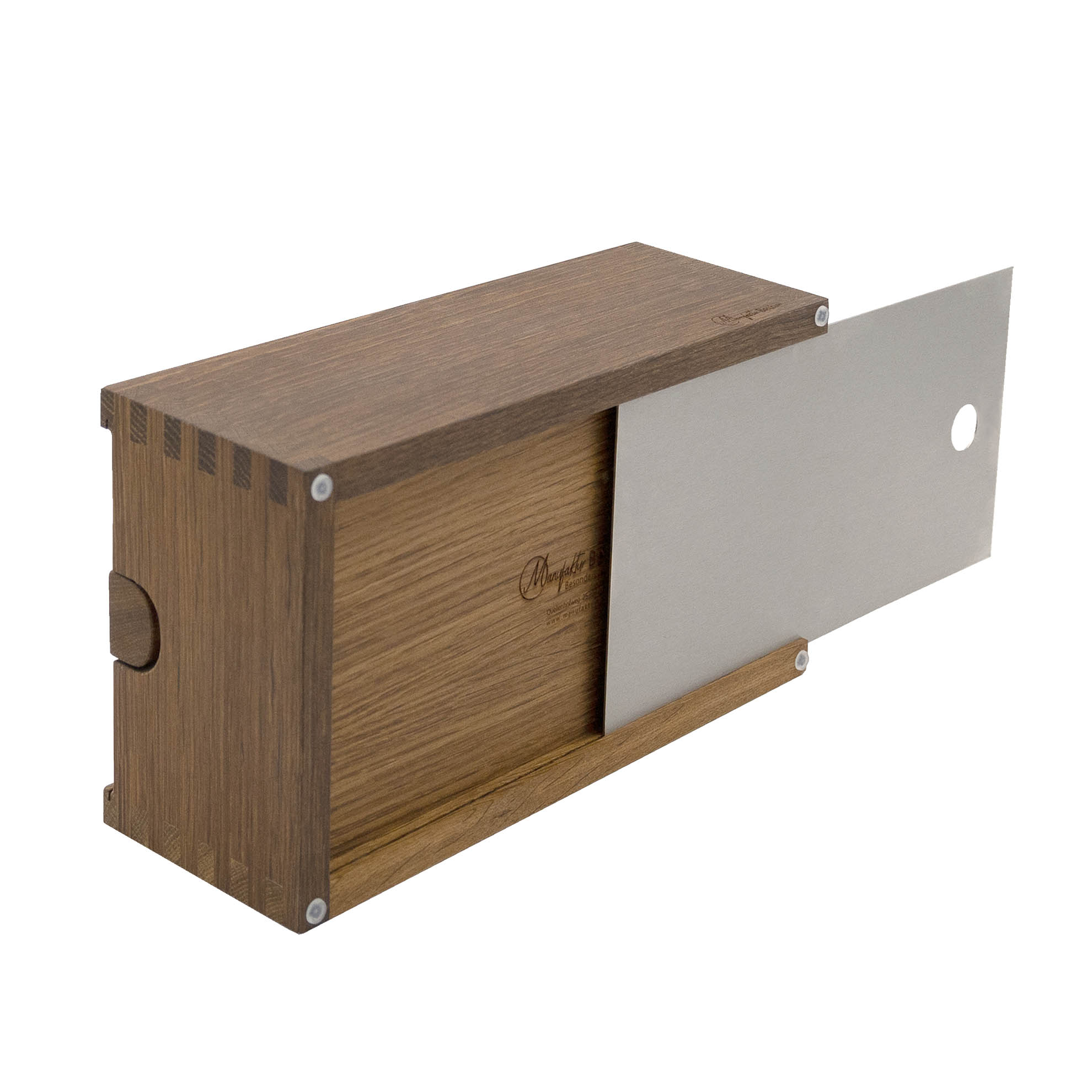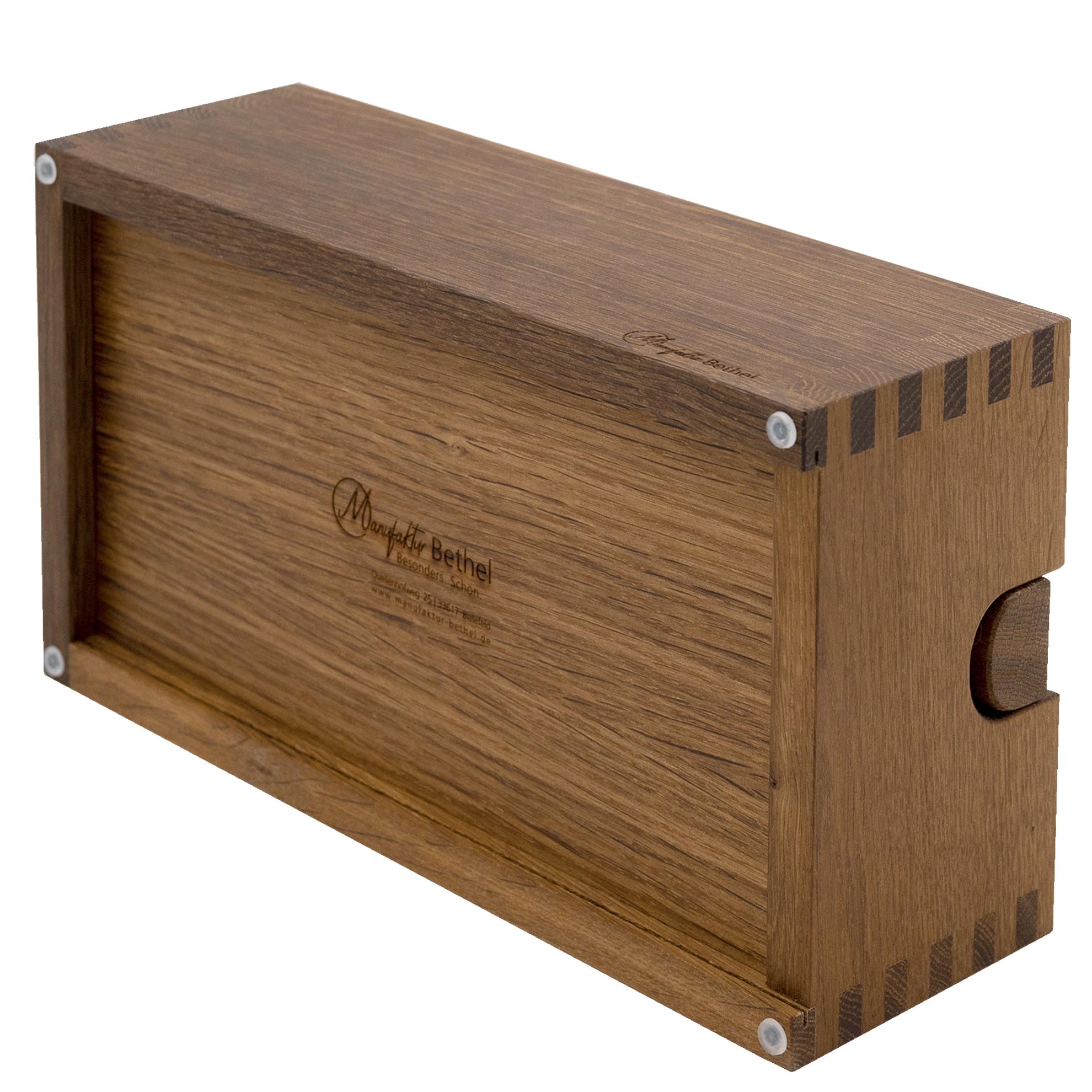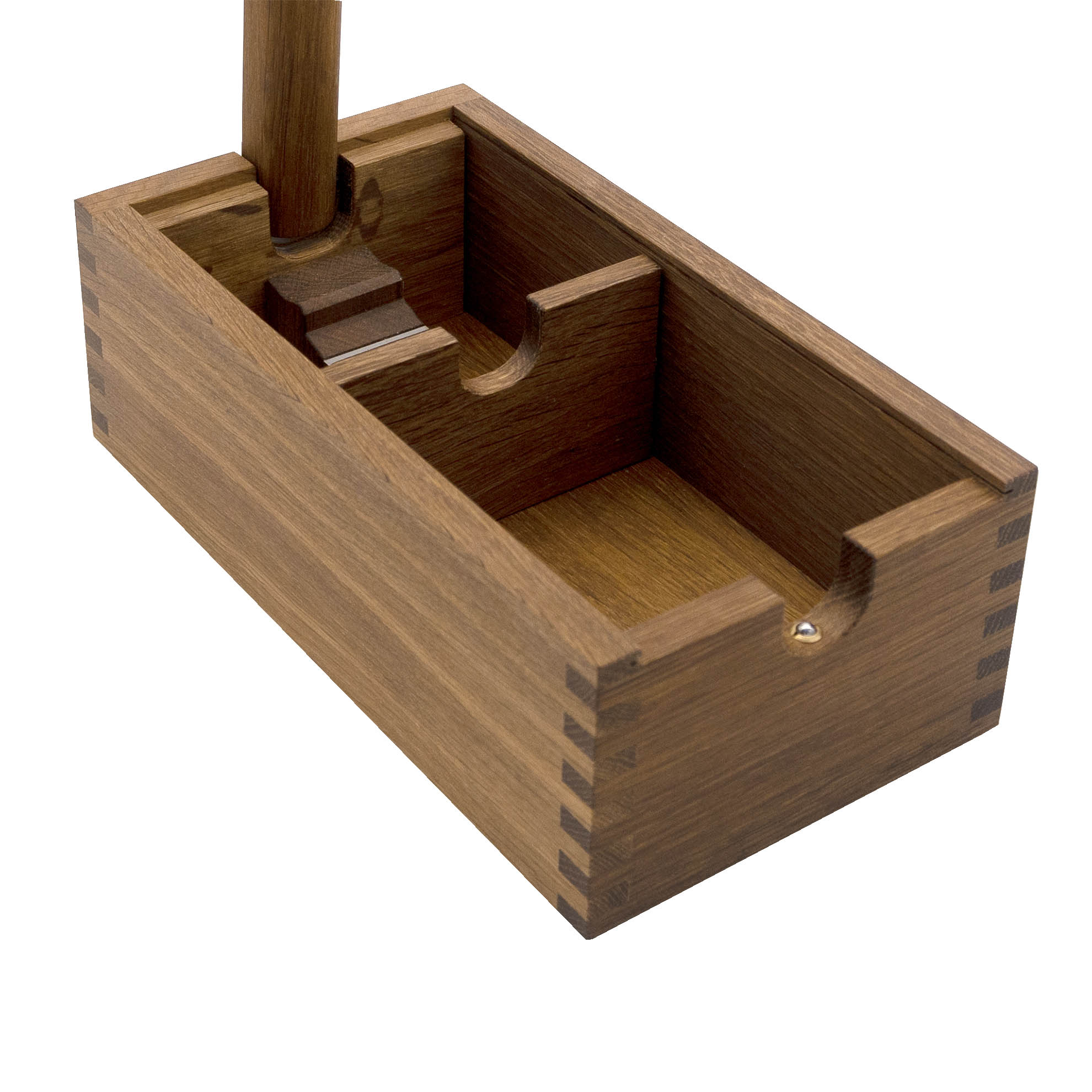 Unser Premiumnussknacker aus massiver, geräucherter Eiche. Mit elegantem Deckel aus hochwertigem gebürstetem Edelstahl,  können Nüsse und Schalen krümelfrei verstaut werden.