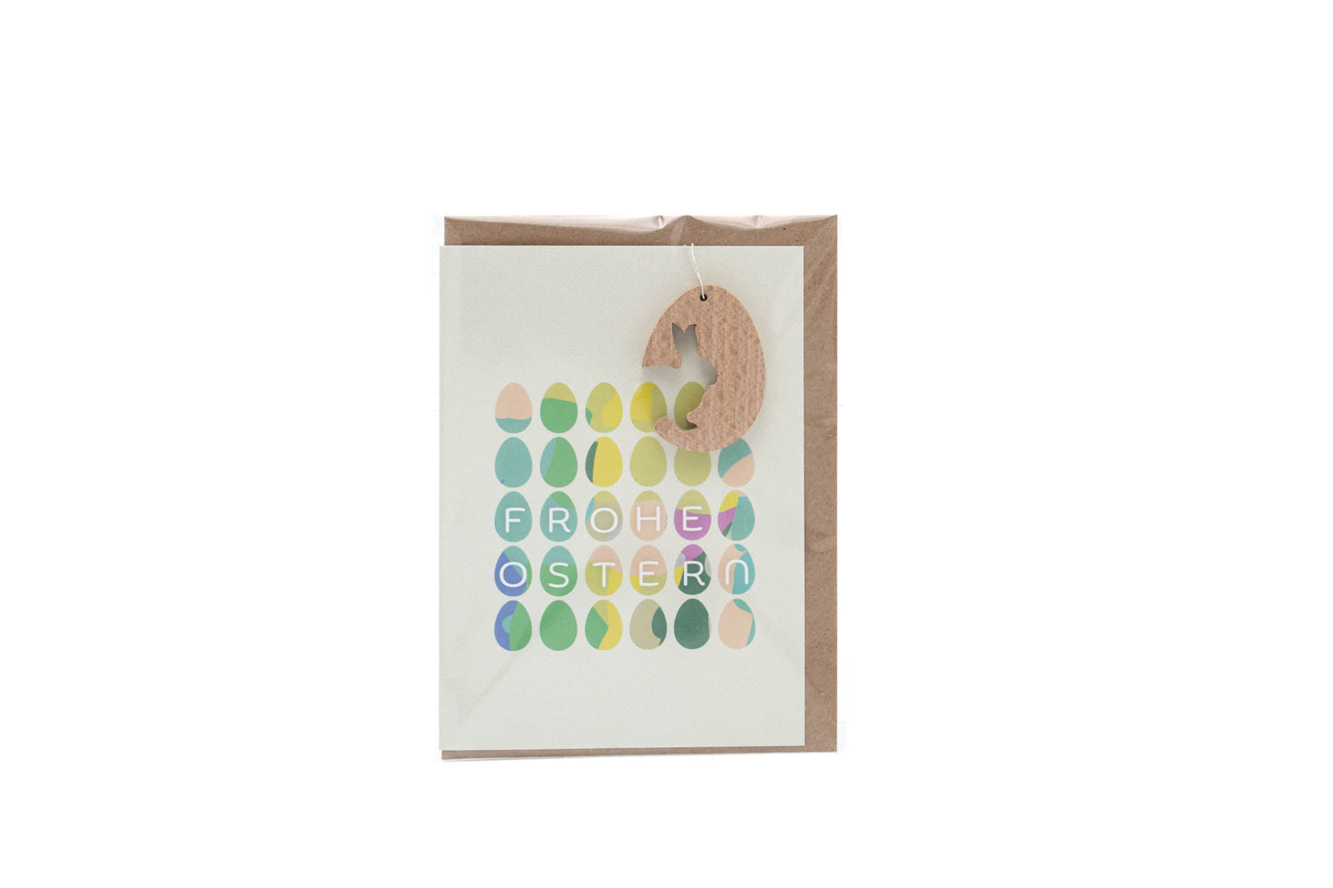Besonderheit:Osteranhänger aus Holz ist wiederverwendbar, Doppelkarte mit Umschlag